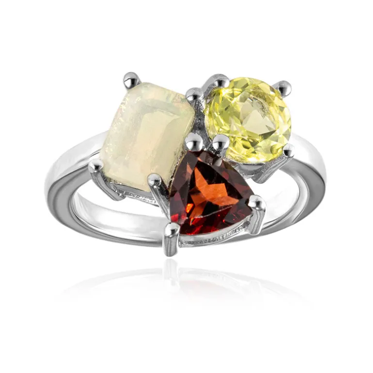 Unser strahlender Ring aus 925er Sterlingsilber präsentiert eine reizvolle Dreifaltigkeit von Edelsteinen. Das Herzstück des Rings ist ein äthiopischer Welo-Opal im Oktagon-Schliff von 0,513 Karat, flankiert von einem pikanten Limettenquarz im Rundschliff von 0,751 Karat und einem Granat aus Mosambik im Trillant-Schliff von 0,855 Karat. Mit einem Gesamtgewicht von 2,119 Karat ist dieser Ring eine Sinfonie der Farben, die jedem Outfit und jedem Anlass Eleganz verleiht. Das schimmernde platinierte Band verleiht diesem einzigartigen und charmanten Accessoire ein luxuriöses Finish.