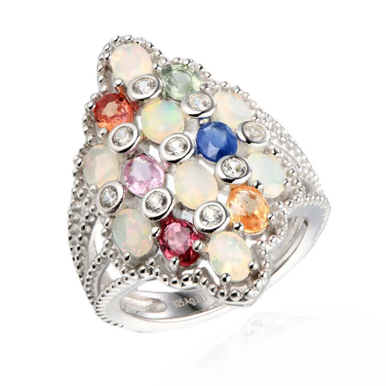 Entdecken Sie einen Regenbogen der Eleganz mit unserem Multicolor Edelstein-Cluster-Ring, der eine exquisite Mischung aus 6 Madagaskar-Saphiren, 8 Welo-Opalen aus Äthiopien und 9 Zirkonsteinen aus Kambodscha mit einem Gesamtgewicht von 2,21 Karat enthält. Jeder Edelstein ist in hochwertigem 925er Sterlingsilber gefasst und sorgfältig geschliffen, um seinen fesselnden Glanz zu maximieren. Dieser Ring ist perfekt geeignet, um Ihrer Alltagskleidung einen farbigen Akzent zu verleihen oder Ihre Abendgarderobe umwerfend zu ergänzen. Er ist eine vielseitige Ergänzung Ihrer Schmucksammlung.