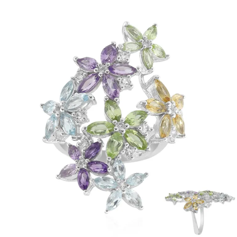 Entdecken Sie mit diesem von Blumen inspirierten Ring aus Sterlingsilber eine lebhafte Farbenpracht. Er besticht durch Amethyste im Marquiseschliff, Citrine, Peridote und Topase aus Brasilien und Myanmar, ergänzt durch strahlend weiße Topase aus Nigeria. Dieses exquisite Stück mit einem Gewicht von 4,58 g ist perfekt, um jedem Ensemble Glanz zu verleihen. Er ist sowohl für den Tag als auch für den Abend geeignet und lässt sich wunderbar mit eleganten Kleidern oder Freizeitoutfits kombinieren.