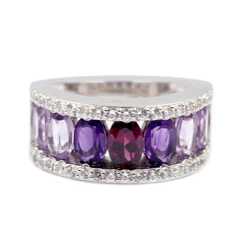 Tauchen Sie ein in die Tiefen violetter Leidenschaft mit diesem bezaubernden Ring aus Sterlingsilber mit einem Gesamtgewicht von 3,57ct. In einem ovalen Schliff angeordnet, verschmelzen die brasilianischen Lavendel-Amethysten und sambischen Amethysten nahtlos mit einem einzelnen indischen Rhodolithen, der von funkelnden tansanischen Zirkon-Akzenten umgeben ist. Dieser Ring ist mit Platin plattiert, was ihm einen zusätzlichen Hauch von Luxus verleiht. Er eignet sich sowohl für die tägliche Eleganz als auch für extravagante Anlässe und ist somit eine vielseitige Ergänzung für jede Schmucksammlung.