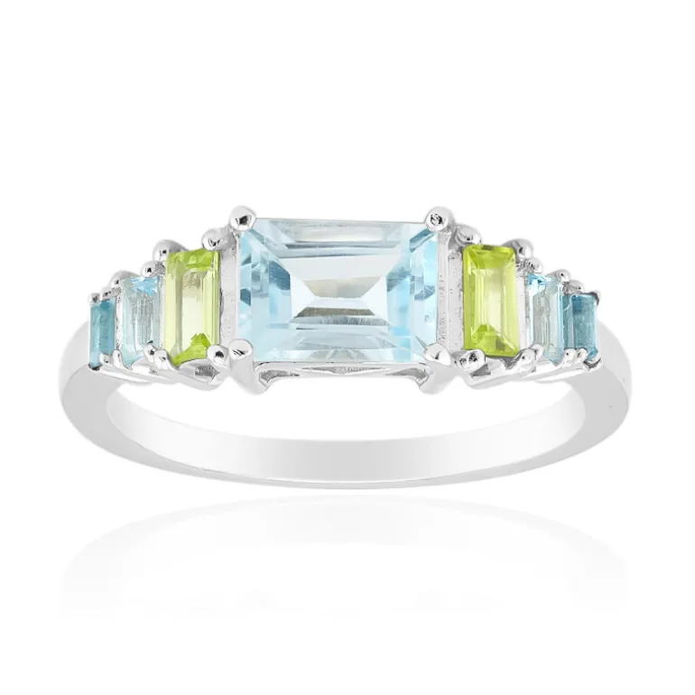 Entdecken Sie die Eleganz dieses exquisiten Silberrings mit einem atemberaubenden brasilianischen himmelblauen Topas als Herzstück. Flankiert von lebhaften burmesischen Peridots und Schweizer und Londoner Blautopasen, verleiht jeder Edelstein im Baguetteschliff einen Hauch von Farbe und Raffinesse. Dieses Schmuckstück eignet sich sowohl für formelle Anlässe als auch für den Alltag. Kombinieren Sie es mit einem eleganten Kleid oder Ihrer Lieblingsbluse, um einen bleibenden Eindruck zu hinterlassen.