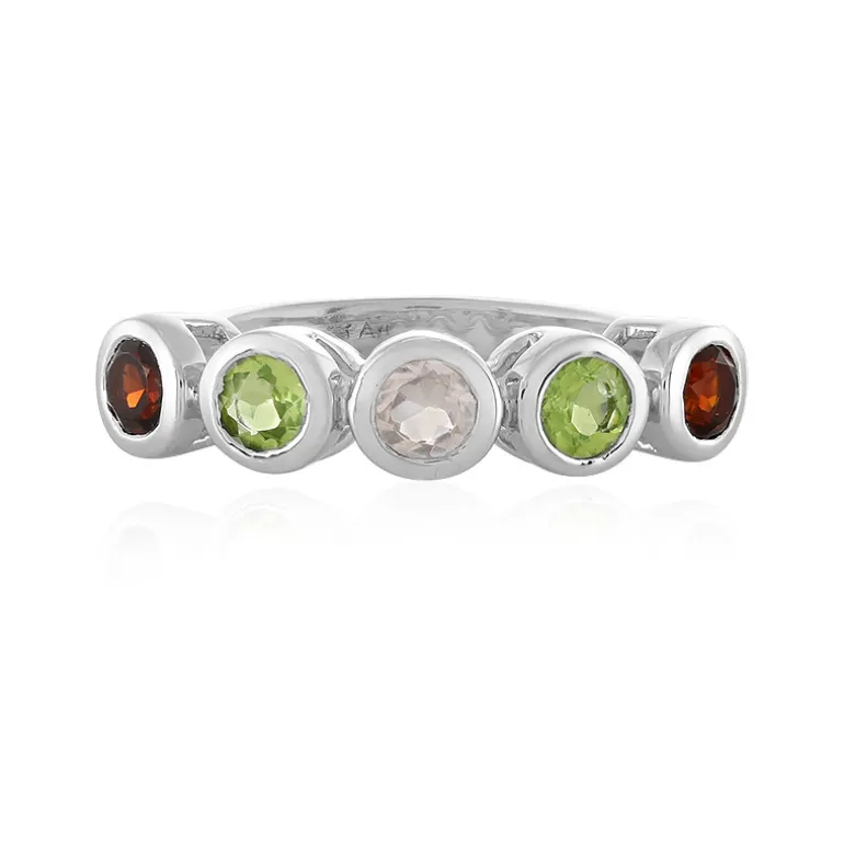 Entdecken Sie die Faszination der Farbe mit diesem atemberaubenden Ring aus 925er Sterling Silber, der mit einem Strauß von Edelsteinen geschmückt ist. Ein pastellfarbener Rosenquarz, ein leuchtender Brandy-Citrin und zwei lebhafte Peridots sind mit einem tiefen Granat gepaart, jeder im Rundschliff und aus den üppigen Ländern Brasilien und China. Mit einem Gesamtkaratgewicht von 1,35 Karat bietet dieser Ring eine Symphonie von Farbtönen, die sich perfekt eignet, um jedem Outfit einen Farbakzent zu verleihen, sei es bei einem legeren Brunch oder einer eleganten Soirée. Sein vielseitiges Design macht ihn zu einer lebendigen Ergänzung Ihrer Schmucksammlung.