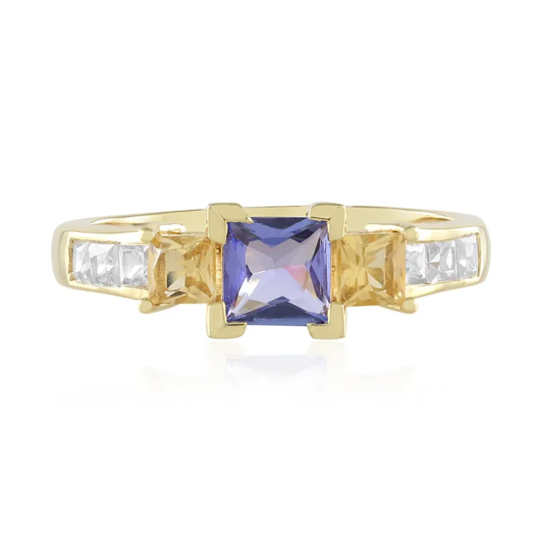 Entdecken Sie die Faszination dieses atemberaubenden, vergoldeten Rings, in dessen Mittelpunkt ein leuchtender Tansanit aus Tansania steht. Flankiert von brasilianischen Zitrinen und kambodschanischen Zirkonen, strahlen die Edelsteine im Prinzessschliff Eleganz aus. Dieser Ring ist ideal, um jedem Outfit einen Hauch von Raffinesse zu verleihen, und eignet sich sowohl für das tägliche Tragen als auch für besondere Anlässe. Lassen Sie sich von seinem Charme und seinen leuchtenden Farben verzaubern und setzen Sie ein Zeichen.