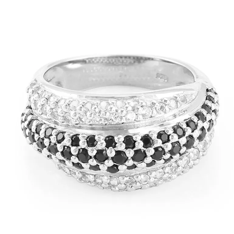 Entdecken Sie die Eleganz dieses atemberaubenden Rings mit schillernden schwarzen Spinellen aus Thailand und schimmernden weißen Topasen aus Brasilien, die in glänzendes 925er Sterlingsilber gefasst sind. Das verschlungene Design und die brillanten Edelsteine im Rundschliff machen ihn zu einem auffälligen Schmuckstück. Perfekt für die Abendgarderobe oder besondere Anlässe, ergänzt es anspruchsvolle Outfits und verleiht Ihrem Ensemble einen Hauch von Glamour.