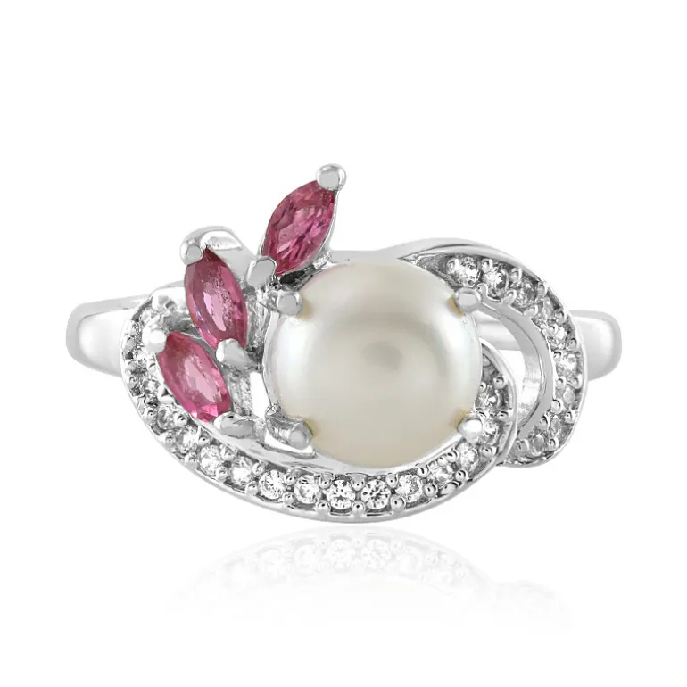 Entdecken Sie die Eleganz dieses atemberaubenden Rings aus Sterlingsilber mit einer weißen Süßwasser-Zuchtperle aus China, die von drei rosa Turmalinen im Marquiseschliff aus Brasilien ergänzt wird. Dieser exquisite Ring ist mit funkelnden Zirkonen verziert und verleiht jedem Ensemble einen Hauch von Eleganz. Er eignet sich sowohl für den Alltag als auch für besondere Anlässe und lässt sich wunderbar mit eleganten Kleidern oder schicken Freizeitoutfits kombinieren.