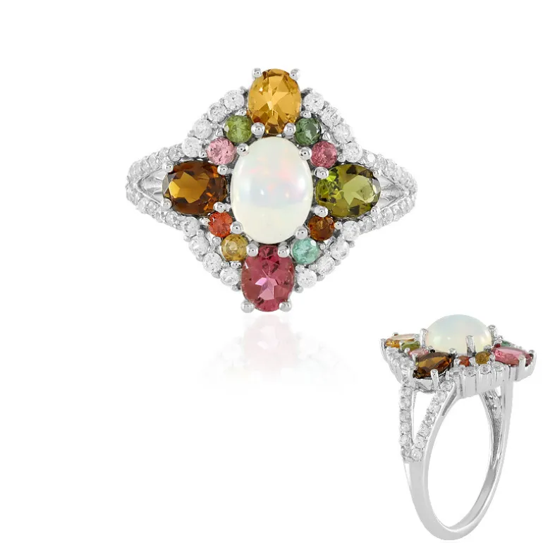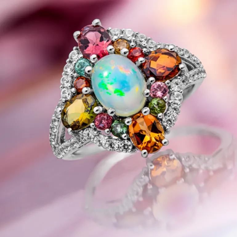 Entdecken Sie das Kaleidoskop der Farben mit diesem bezaubernden Ring, dessen Herzstück ein schimmernder äthiopischer Welo-Opal ist, der von einer Reihe leuchtender Turmaline aus Madagaskar umrahmt wird. Das faszinierende Farbspiel des Opals ergänzt die satten Farbtöne der Turmaline, während funkelnde Zirkon-Akzente aus Kambodscha für einen Hauch von Brillanz sorgen. Der Ring aus platiniertem 925er Sterling Silber hat ein Gesamtgewicht von 2,738 Karat und ist das perfekte Schmuckstück für jedes elegante Ensemble. Er eignet sich ideal für besondere Anlässe oder als auffälliges Accessoire für den täglichen Gebrauch und ist ein vielseitiges Accessoire für alle, die die einzigartige Schönheit natürlicher Edelsteine zu schätzen wissen.