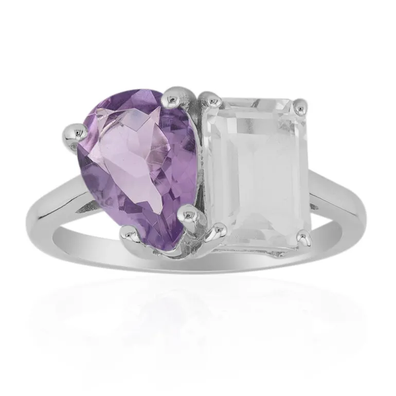 Dieser atemberaubende Ring zeigt die Schönheit eines brasilianischen Amethysten gepaart mit einem nigerianischen weißen Topas. Eine perfekte Kombination aus einem 1,56 Karat Amethyst in Tropfenform und einem 1,94 Karat Topas im Oktagon-Schliff auf einem 925er Sterlingsilberband. Mit einem Gesamtgewicht von 3,49 Karat und den Maßen 23×20 mm ist der Ring ein auffälliges Schmuckstück. Dieser Ring ist ideal, um Ihrem Ensemble einen Farbtupfer zu verleihen. Er ist vielseitig genug, um sowohl tagsüber schick als auch abends elegant zu sein.