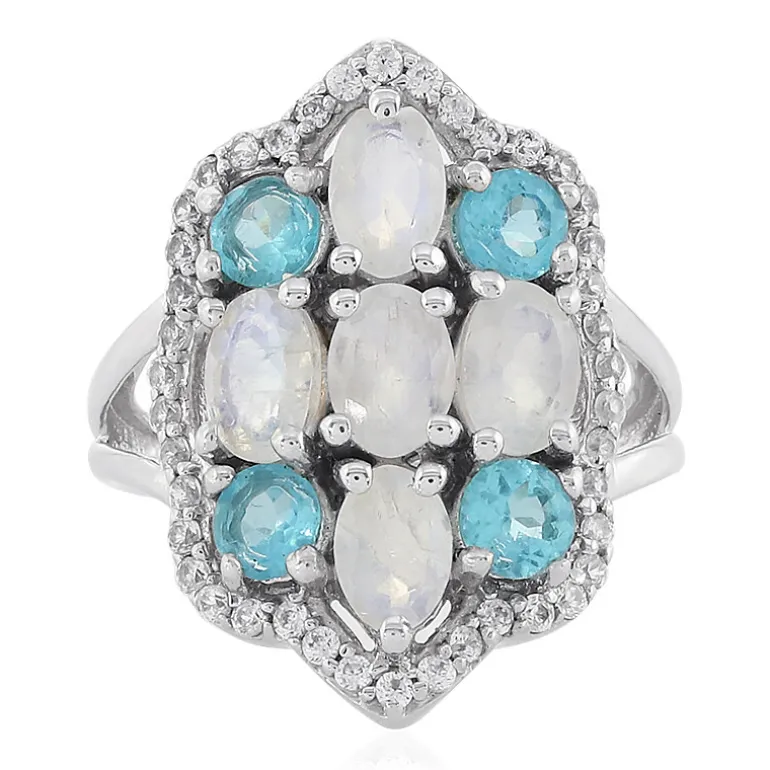 Dieser bezaubernde Ring besticht durch ein Arrangement von 5 Regenbogen-Mondsteinen mit einem Gesamtgewicht von 2,157 ct, elegant ergänzt durch 4 leuchtend blaue Apatite aus Madagaskar mit einem Gewicht von 1,074 ct und umgeben von 42 funkelnden kambodschanischen Zirkon-Edelsteinen. Das 3,893 ct schwere Schmuckstück ist in hochwertigem 925er Sterlingsilber gefasst und zeigt ein klassisches Design mit ovalem und rundem Schliff. Sein vielseitiger Stil macht ihn zu einer exquisiten Wahl sowohl für legere als auch für formelle Kleidung, die jedes Ensemble mit einem Hauch von Schillern und azurblauer Schönheit erhellt.
