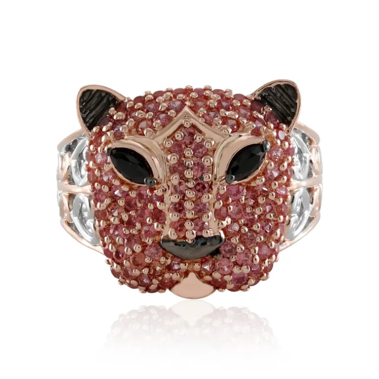 Zeigen Sie Ihre wilde Seite mit diesem atemberaubenden Ring mit Leopardenmotiv, der mit 95 schimmernden Padparadscha-Saphiren aus Tansania von insgesamt 1,304 ct. verziert ist. Flankiert von kontrastierenden Schwarzspinell-Augen im Marquiseschliff, ist dieses Schmuckstück ein wahres Zeugnis von Design und Handwerkskunst. Der meisterhaft in 925er Sterlingsilber gefasste Ring mit einem Gewicht von 7,17 g setzt die Anziehungskraft exotischer Edelsteine auf verspielte und doch opulente Weise in Szene. Dieser auffällige Ring kann ein klassisches Cocktailkleid aufwerten oder Ihrer Alltagskleidung eine abenteuerliche Note verleihen.