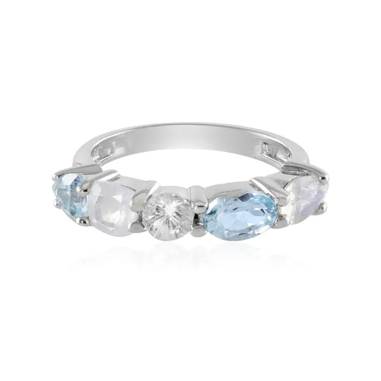Entdecken Sie die himmlische Schönheit dieses Rings aus 925er Sterlingsilber, der mit einer Konstellation von Edelsteinen verziert ist. Er besteht aus einer harmonischen Mischung aus himmlischen indischen Mondsteinen und lebhaften brasilianischen Topasen von insgesamt 2,025 Karat, die das Rätsel des Nachthimmels einfangen. Die komplizierten Schliffe – ein Tropfen, ein antikes Kissen, ein Oval und ein Trilliant – verstärken das den Steinen innewohnende Leuchten, das durch einen funkelnden kambodschanischen Zirkon perfekt ergänzt wird. Dieses Schmuckstück ist ein idealer Akzent sowohl für den Tag als auch für den eleganten Abend und verspricht, auf Schritt und Tritt Bewunderung zu ernten.