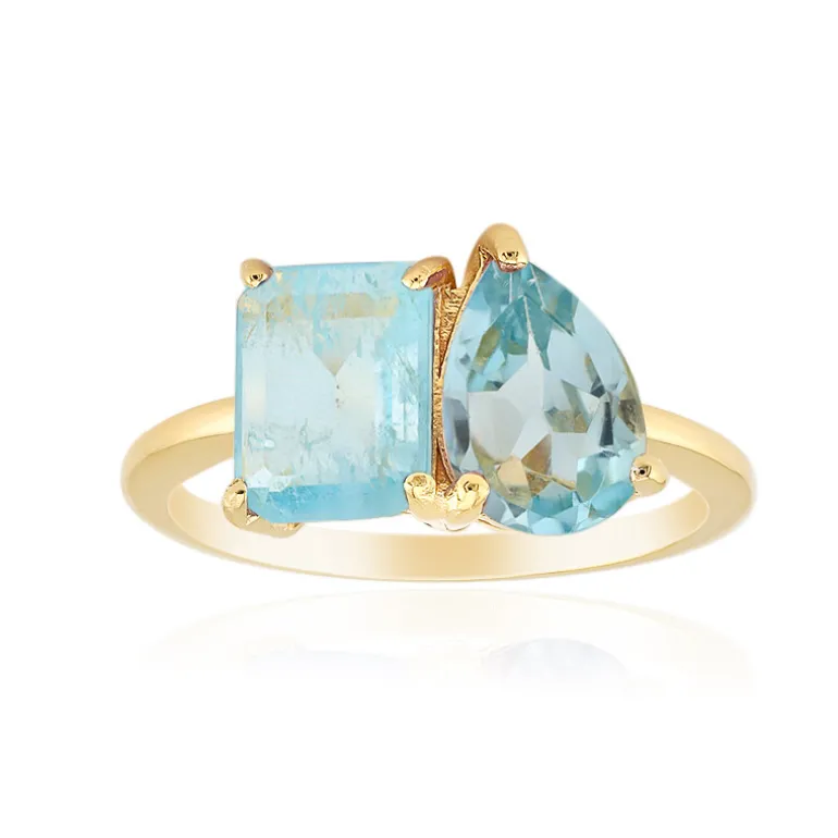 Entdecken Sie die bezaubernde Anziehungskraft dieses Rings mit einem atemberaubenden himmelblauen Topas und einem pastellblauen Quarz, die beide aus Brasilien stammen. Das in vergoldetem 925er Sterlingsilber gefasste 2,444-karätige Meisterwerk besticht durch seine einzigartige Kombination aus Birnen- und Achteckschliff. Er eignet sich sowohl für zwanglose Ausflüge als auch für elegante Abende. Kombinieren Sie ihn mit gedeckten Tönen oder kräftigen Farben, um die Edelsteine erstrahlen zu lassen.