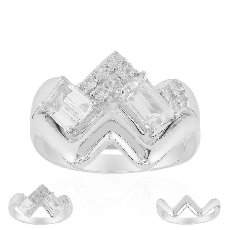 Entdecken Sie die Eleganz dieses Sterlingsilberrings mit zwei brasilianischen weißen Topasen im Baguetteschliff. Akzentuiert mit Zirkonen aus Tansania, glänzt dieses Stück mit einem Gesamtkaratgewicht von 1,416 ct. Das filigrane Design ist ideal für formelle Anlässe oder für den Alltag und passt hervorragend zu Abendkleidern oder einem schicken schwarzen Kleid. Eine zeitlose Ergänzung für jede Schmucksammlung.