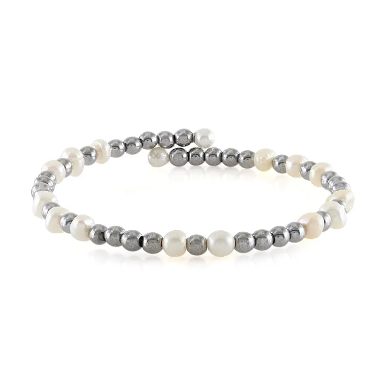 Dieser bezaubernde Armreif verbindet die schlichte Eleganz weißer Süßwasserperlen aus China mit dem industriellen Charme silberner Hämatitperlen aus den USA. Mit einem Gesamtkaratgewicht von 23,224 ct umhüllt dieser 60×60 mm große Stahlarmreif das Handgelenk mit abwechselnd leuchtenden und metallischen Kugeln. Er ist ideal, um einem legeren Outfit einen Hauch von Raffinesse zu verleihen oder ein schickes Abendoutfit zu ergänzen und geht nahtlos von der Eleganz des Tages in die Anmut der Nacht über.