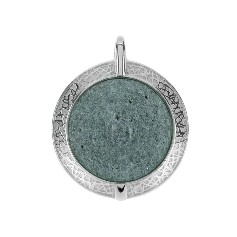 Entdecken Sie die Anziehungskraft unseres brasilianischen Fuchsit-Anhängers, der von einem schimmernden, 16 mm großen, runden Cabochon mit grünem Farbton akzentuiert wird. Dieses Schmuckstück aus Sterlingsilber mit einem Gewicht von ca. 3,18 g ist mit filigranen Details am Rand versehen, die seinen Zauber noch verstärken. Er ist ein ideales Accessoire für die Natur und passt zu erdigen Farbtönen, die bei gesellschaftlichen Anlässen oder Freizeitaktivitäten besonders gut zur Geltung kommen.