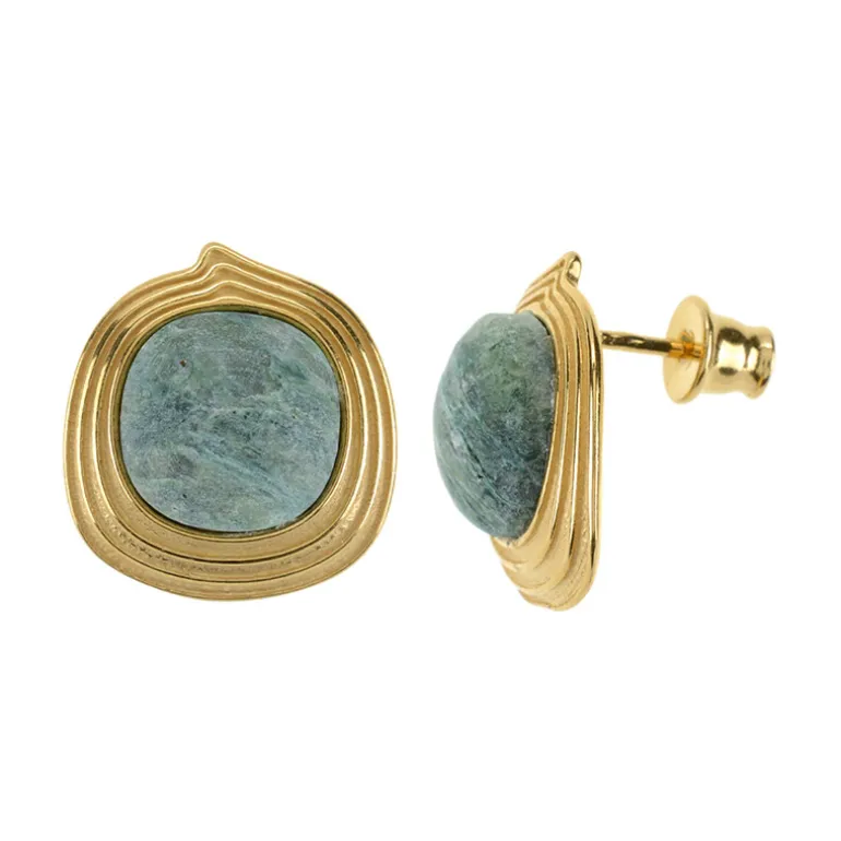 Schmücken Sie Ihre Ohren mit der heiteren Eleganz dieser vergoldeten Ohrringe aus Sterlingsilber mit 7,91 Karat antikem brasilianischem Fuchsit-Cabochon. Die gesprenkelten grünen Edelsteine sind in einen warmen Goldton eingefasst und bieten einen klassischen Touch mit einem modernen Touch. Mit einem Gewicht von ca. 3,32 g sind diese Ohrringe ein bequemes und stilvolles Accessoire für jeden Anlass, vom Tagesausflug bis zur Abendveranstaltung.