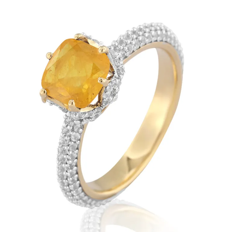 Entdecken Sie den verführerischen Charme dieses gelben Saphirrings aus Madagaskar, einem Schatz von der exotischen Insel selbst. Mit einem antiken Kissenschliff von 1,575 Karat, eingefasst in ein Meer von 191 kambodschanischen Zirkonen von insgesamt 2,235 Karat, ist dieser Ring eine Symphonie aus Funkeln und lebendiger Farbe. Der Ring ist aus hochwertigem 925er Sterlingsilber mit einem Gewicht von 2,32 g gefertigt und weist ein Gesamtgewicht von 3,81 ct auf. Die Abmessungen von 28 x 23 mm verleihen ihm einen substanziellen und doch eleganten Auftritt, der sowohl tagsüber als auch abends einen Hauch von Sonnenschein verbreitet. Kombinieren Sie ihn mit erdigen Neutraltönen oder kontrastierenden Blautönen für einen atemberaubenden Effekt.