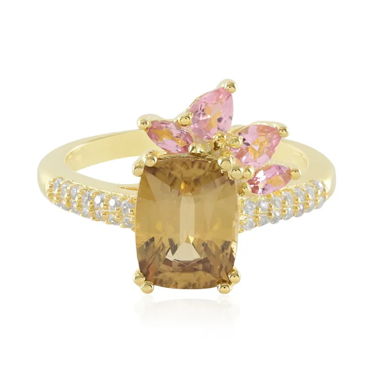 Dieser atemberaubende Ring mit einem gelben Zirkon im antiken Brillantschliff von 2,95 Karat, der aus dem mineralreichen Tansania stammt, verleiht Ihnen einen Hauch von Eleganz. Flankiert von rosafarbenen nigerianischen Turmalinen in zwei exquisiten Schliffen hat dieses Schmuckstück ein Gesamtgewicht von 3,55 Karat. Dieser Ring aus vergoldetem 925er Sterlingsilber mit einem Gewicht von ca. 3,28 g ist mit Zirkonen aus Kambodscha besetzt, die sein Funkeln noch verstärken. Er eignet sich sowohl für den Charme des Tages als auch für den Glamour des Abends und ist eine vielseitige Ergänzung für jede Schmucksammlung.
