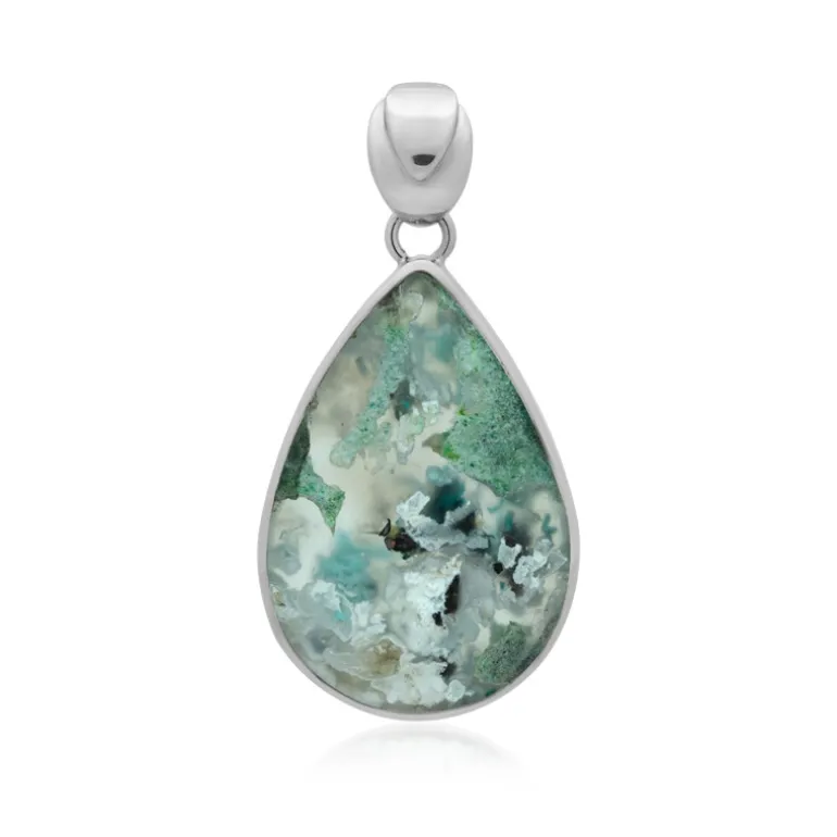 Entdecken Sie die bezaubernde Schönheit unseres tropfenförmigen Gem Silica-Anhängers, ein Edelsteinschatz, der von den üppigen Inseln Indonesiens stammt. Dieses exquisite Stück präsentiert einen 12,98ct Gem Silica Cabochon, der in hochwertiges 925er Sterlingsilber mit einer glänzenden Platinbeschichtung gefasst ist und etwa 3,5g wiegt. Das Design des Anhängers erinnert an die heitere Farbpalette tropischer Gewässer und macht ihn zu einem idealen Accessoire sowohl für zwanglose Ausflüge als auch für elegante Zusammenkünfte. Peppen Sie Ihre Garderobe mit diesem atemberaubenden Stück auf, das die Mystik Balis widerspiegelt.