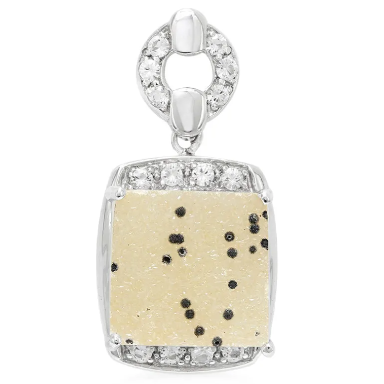 Entdecken Sie die Anziehungskraft dieses raffinierten Anhängers aus brasilianischem Glitzerachat von 15 Karat, der von 0,59 Karat funkelnden weißen Topasen umgeben ist. Der antike Kissen-Cabochon-Schliff verleiht der natürlichen Schönheit des Achats einen einzigartigen Charme, der durch die Brillanz der Topase im Rundschliff noch verstärkt wird. Der Anhänger aus 925er Sterlingsilber mit einem Gewicht von ca. 4,66 g ist eine Verschmelzung von klassischer Eleganz und modernem Design und misst 34 x 17 mm. Er ist ein vielseitiges Accessoire, das sowohl der Tages- als auch der Abendgarderobe einen Hauch von Glamour verleihen kann.