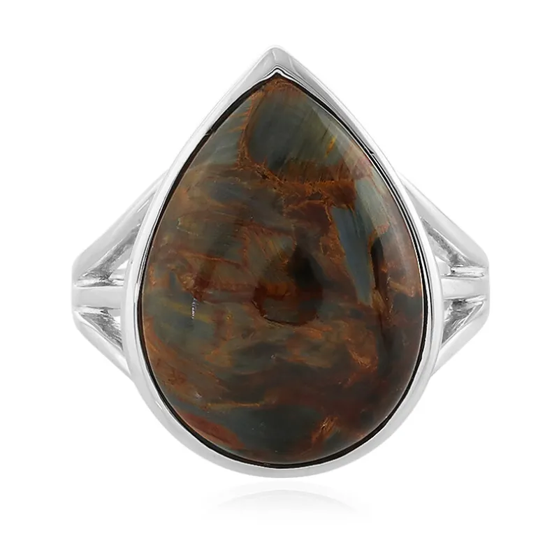 Entdecken Sie die faszinierenden Wirbel eines namibischen Goldenen Pietersits, der meisterhaft zu einem 7,64 Karat schweren tropfenförmigen Cabochon geformt wurde. Dieser Ring aus Sterlingsilber zeigt einen 18×13 mm großen, dunkel schimmernden Edelstein, der in ein schlankes 925er Silberband mit einem Gewicht von etwa 3,81 Gramm eingefasst ist. Die Abmessungen von 25×20 mm sorgen für einen kühnen und doch eleganten Auftritt. Die erdigen Töne dieses Rings machen ihn zu einem idealen Accessoire sowohl für lässige Nachmittage als auch für Abendveranstaltungen. Er passt mühelos zu einer Reihe von Outfits, von Business-Kleidung bis hin zu Bohème-Chic.