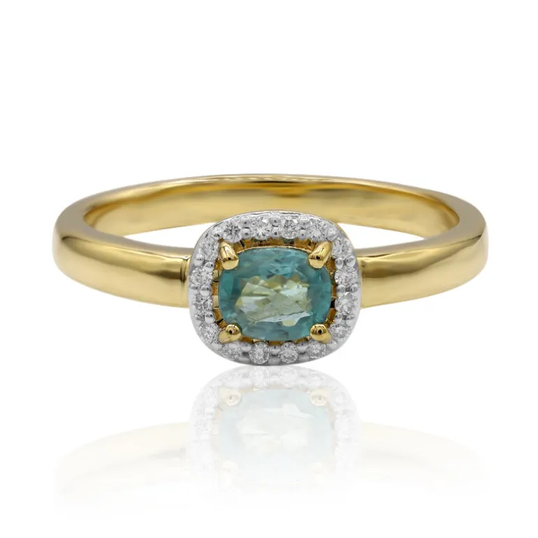 Dieser Ring von AMAYANI präsentiert einen seltenen Grandidierit im Kissenschliff von 0,36 Karat, der von einem Heiligenschein aus funkelnden Diamanten von insgesamt 0,072 Karat umgeben ist. Der Ring ist aus prächtigem 18-karätigem Gelbgold gefertigt, wiegt etwa 3,79 g und hat einen raffinierten Antikschliff, der die einzigartige Farbe des Edelsteins hervorhebt. Sein zeitloses Design verspricht eine wertvolle Ergänzung Ihrer Sammlung und eine elegante Ergänzung zu jedem Outfit zu werden, perfekt für besondere Anlässe oder als luxuriöses Accessoire für Ihren Alltag.
