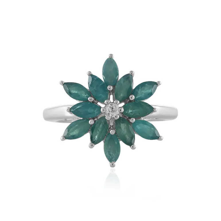 Entdecken Sie die ruhige Schönheit dieses Rings mit Grandidierit aus Madagaskar, der aus 12 Steinen im Marquiseschliff besteht, die in einem bezaubernden Blumenmuster angeordnet sind. Der kambodschanische Zirkon in der Mitte verleiht der Fassung aus platiniertem 925er Sterlingsilber ein subtiles Funkeln. Dieser perfekt ausbalancierte Ring verleiht jedem Ensemble einen Hauch von raffinierter Eleganz und ist damit die ideale Wahl für besondere Anlässe oder den Alltag.