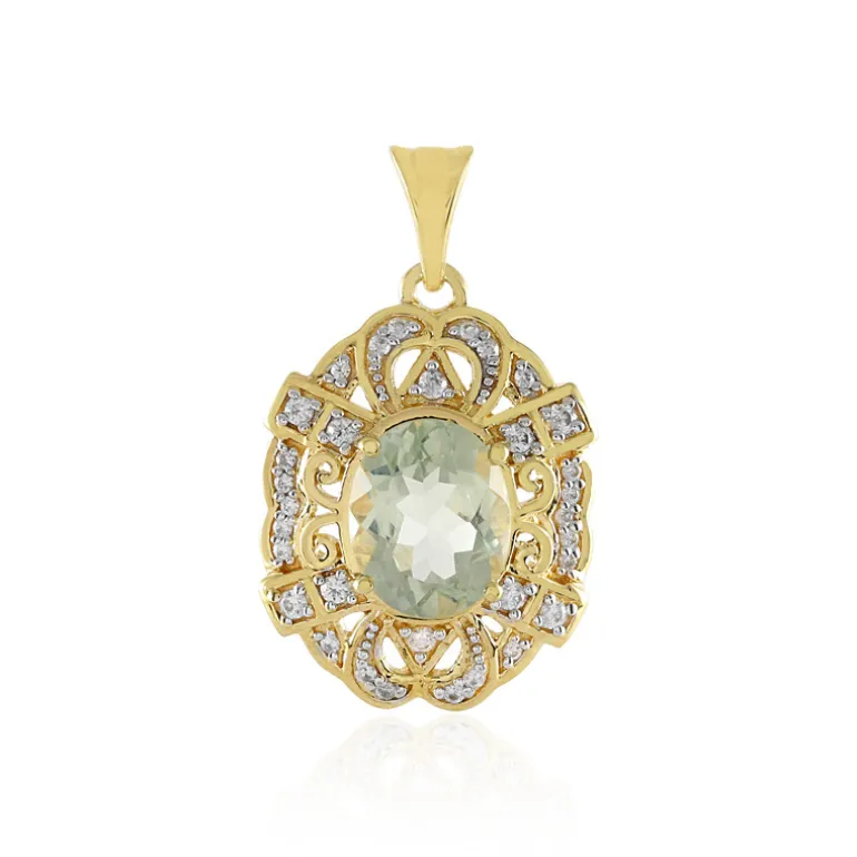Dieser bezaubernde Anhänger besteht aus einem ovalen brasilianischen grünen Amethyst von 2,07 Karat, der in vergoldetem 925er Sterling Silber eingebettet ist und mit funkelnden kambodschanischen Zirkon-Akzenten von insgesamt 0,198 Karat verziert ist. Das filigrane, durchbrochene Design erinnert an die Eleganz des Vintage-Stils und macht ihn zu einem zeitlosen Schmuckstück, das sowohl im Alltag als auch bei besonderen Anlässen einen Hauch von Raffinesse versprüht. Ideal für alle, die raffinierten Stil und einen Hauch von Farbe zu schätzen wissen.