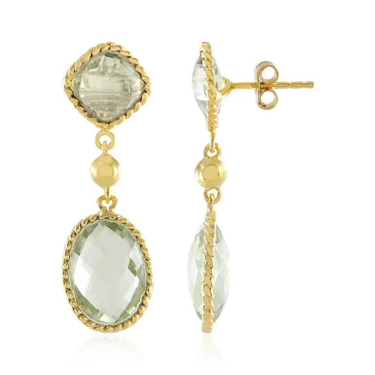 Entdecken Sie den strahlenden Charme dieser Ohrringe, die den subtilen Reiz brasilianischer grüner Amethyste zur Geltung bringen. Ein Duo aus ovalen und antiken Edelsteinen im Schachbrettschliff mit einem Gesamtgewicht von 10,822 Karat ist elegant in vergoldetes 925er Sterlingsilber eingefasst. Sie schimmern in einem pastellgrünen Farbton und baumeln mit Anmut, was sie zu einer idealen Wahl sowohl für die Raffinesse des Tages als auch für die Eleganz des Abends macht. Diese Ohrringe mit einer Länge von 36 mm werten jedes Ensemble auf und eignen sich perfekt für besondere Momente oder als kostbares Geschenk.