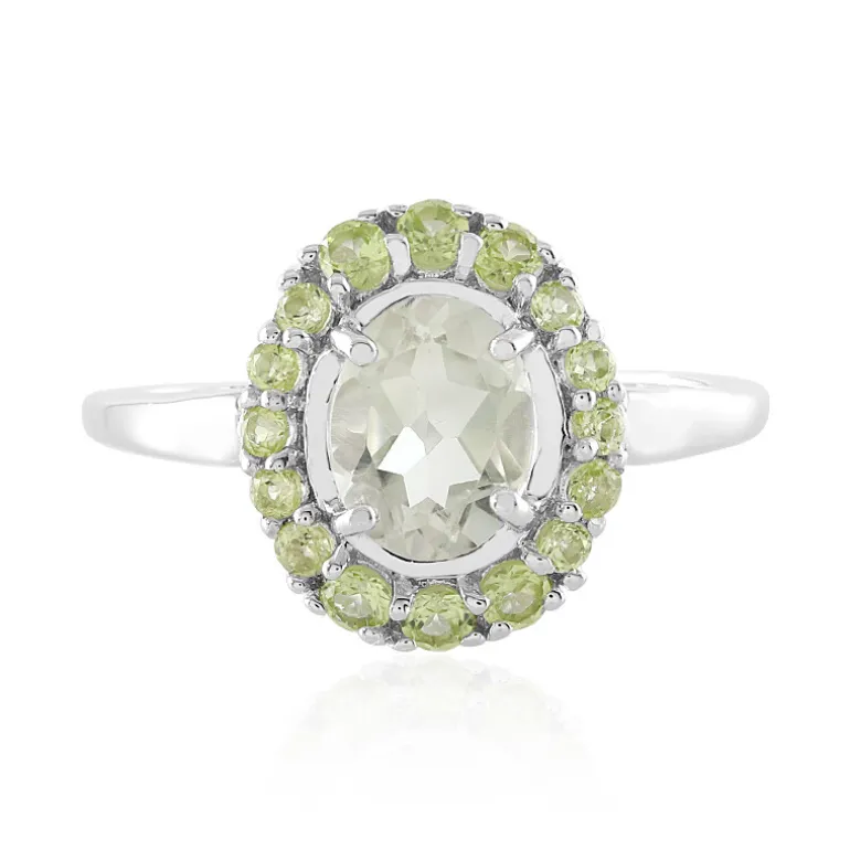 Entdecken Sie die Faszination dieses atemberaubenden Silberschmucks mit einem leuchtenden brasilianischen grünen Amethysten im Ovalschliff, der von einem Kranz funkelnder Peridots im Rundschliff umgeben ist. Das elegante Design hat ein Gesamtgewicht von 2,35 Karat und ist in hochwertiges 925er Sterlingsilber gefasst. Dieser Ring eignet sich perfekt, um jedem Outfit einen Hauch von Raffinesse zu verleihen und ist ideal für besondere Anlässe oder als schickes Accessoire für jeden Tag. Die Kombination der erfrischenden Grüntöne schafft ein harmonisches Gleichgewicht und macht ihn zu einer faszinierenden Ergänzung für jede Schmucksammlung.