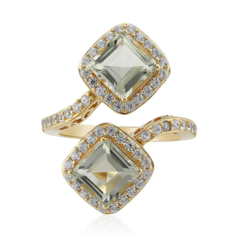 Entdecken Sie die Eleganz dieses exquisiten Rings mit 2 grünen Amethysten im Oktagon-Schliff aus Brasilien von insgesamt 3,695 Karat. Akzentuiert durch 56 Zirkone im Rundschliff aus Tansania, bietet dieses Stück ein fesselndes Funkeln. Es ist aus vergoldetem 925er Sterlingsilber gefertigt und wiegt etwa 4,71 Gramm. Perfekt für besondere Anlässe oder als raffiniertes Accessoire für das tägliche Outfit.