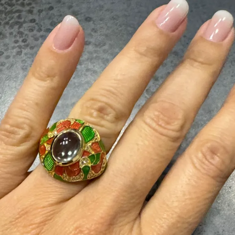 Entdecken Sie die Anziehungskraft dieses atemberaubenden Rings mit brasilianischem grünem Amethyst, der mit seinem großen ovalen Cabochon von 2,16 Karat ein wahrer Schatz ist. Eingebettet in 925 vergoldetes Sterling Silber, werden die leuchtenden Farben des Amethysten perfekt durch ein kompliziertes Ensemble von 42 funkelnden kambodschanischen Zirkonen von insgesamt 0,491ct ergänzt. Die kunstvolle Kombination aus grüner und roter Emaillierung erhöht die Attraktivität des Rings und macht ihn zu einem perfekten Accessoire sowohl für zwanglose Brunches als auch für formelle Galas. Sein einzigartiges Design ist eine Verbeugung vor der Pracht der Natur und ein Fest der anspruchsvollen Kunstfertigkeit.