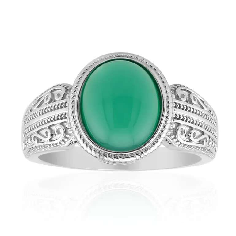Entdecken Sie den heiteren Charme dieses Rings aus grünem Aventurin, der elegant aus feinem 925er Sterlingsilber gefertigt ist. Der ovale Cabochon aus Brasilien mit einem Gewicht von 1,98 Karat und einer Größe von ca. 10 x 8 mm ist wunderschön in ein kompliziertes Design eingefasst und verspricht eine auffällige Ergänzung für jedes Outfit zu sein. Sein bezaubernder grüner Farbton eignet sich perfekt, um Ihrem Ensemble einen Hauch von naturinspirierter Raffinesse zu verleihen, was ihn zu einem idealen Accessoire sowohl für zwanglose Brunches als auch für formelle Abendveranstaltungen macht.
