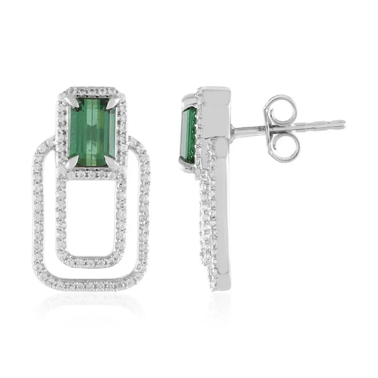 Diese atemberaubenden Ohrringe bestehen aus exquisiten grünen Benedito-Turmalinen aus Brasilien, die durch funkelnde Zirkone aus Kambodscha perfekt ergänzt werden. Das elegante Design mit achteckigem Stufenschliff ist aus platiniertem 925er Sterlingsilber gefertigt und verleiht ihnen einen Hauch von Raffinesse. Ideal für legere und formelle Anlässe. Kombinieren Sie diese Ohrringe mit einem eleganten schwarzen Kleid oder lässiger Abendgarderobe für einen mühelos schicken Look.