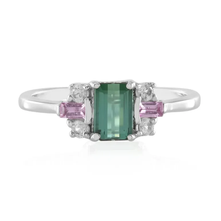 Entdecken Sie die Eleganz Ihres Fingers mit diesem atemberaubenden Ring aus brasilianischem grünem Turmalin, der von rosafarbenen Ceylon-Saphiren und funkelnden Zirkonen geschmückt wird. Der Ring ist aus platiniertem 925er Sterling Silber gefertigt und hat ein Gesamtkaratgewicht von 0,771 ct. Der achteckige Stufenschliff des Hauptturmalins, flankiert von Saphiren im Baguetteschliff, erzeugt ein auffälliges Lichtspiel. Dieser Ring eignet sich sowohl für den Alltag als auch für besondere Anlässe. Mit seiner zeitlosen Raffinesse und einem Hauch von farbenfrohem Charme wird er jedes Ensemble ergänzen.