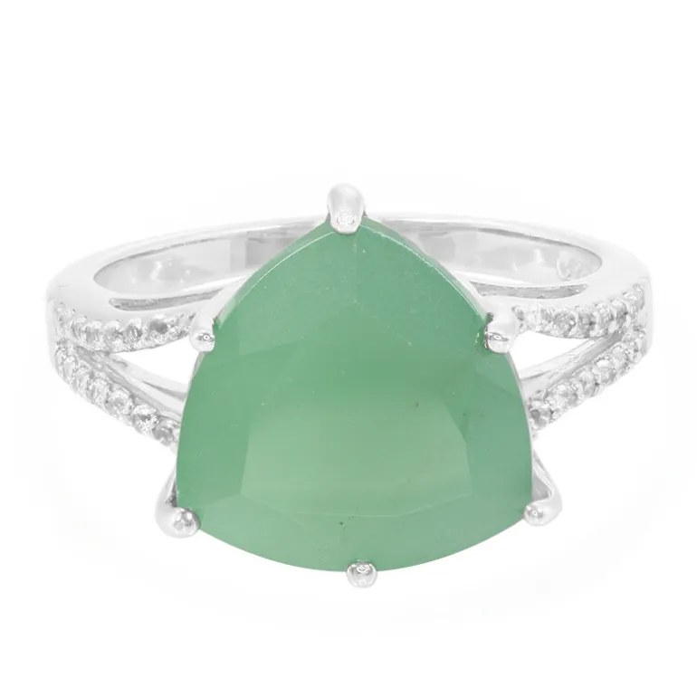 Dieser auffällige Ring präsentiert einen brasilianischen grünen Chalcedon, der mit seinem exquisiten Schliff in Form eines 5,22-karätigen Trillanten die Aufmerksamkeit auf sich zieht. Der zentrale Edelstein ist in 925er Sterling Silber gefasst und wird durch funkelnde weiße Topase von insgesamt 0,147 ct ergänzt. Die geometrische Schönheit des Rings mit den Maßen 28 x 21 mm macht ihn zu einem modernen Schmuckstück. Dieses Schmuckstück eignet sich perfekt, um jedem Outfit einen raffinierten Farbakzent zu verleihen, und ist sowohl für lässige Brunchs als auch für elegante Abendveranstaltungen geeignet.
