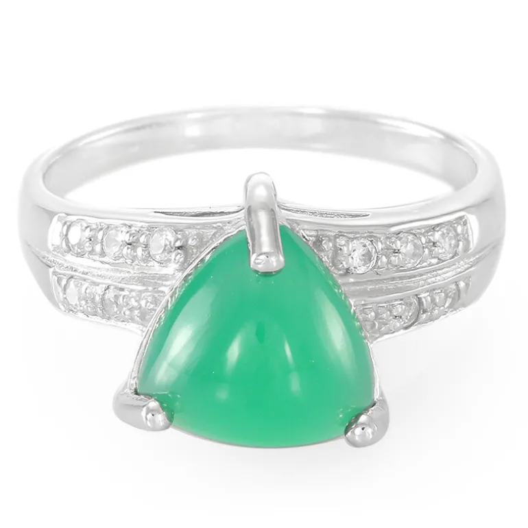 Entdecken Sie die lebendige Anziehungskraft dieses Rings aus brasilianischem grünem Chalcedon, gekrönt von einem glänzenden Trilliant-Cabochon von 3,21 Karat. Elegant umrahmt von 10 funkelnden kambodschanischen Zirkonsteinen von insgesamt 0,235 Karat, wird seine Schönheit durch den Glanz von 925er Sterlingsilber mit einem Gewicht von ca. 3,29 Gramm noch verstärkt. Mit seinem frischen grünen Farbton und seinem modernen Design ist dieser Ring ein perfektes Accessoire sowohl für legere als auch für formelle Kleidung und vervollständigt jedes Ensemble mit einem Hauch von Raffinesse.