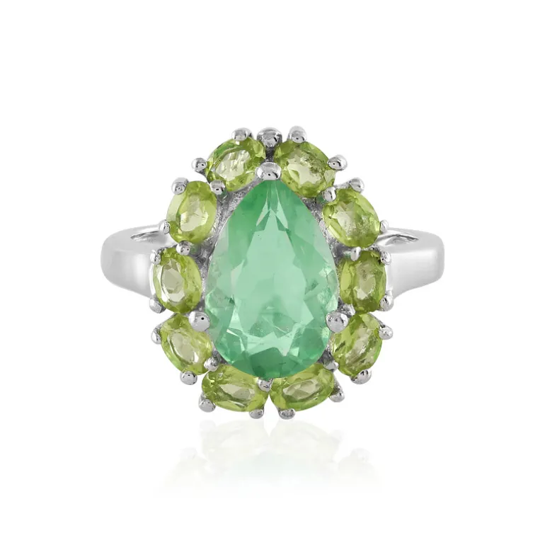 Dieser Ring strahlt in den üppigen Farben der Natur und präsentiert einen atemberaubenden grünen Fluorit von 2,601 Karat in Tropfenform, der von einer Reihe funkelnder Peridots im Ovalschliff von insgesamt 1,458 Karat umgeben ist. Der Ring ist aus hochwertigem 925er Sterlingsilber gefertigt und zeichnet sich durch ein harmonisches Gleichgewicht von leuchtenden Grüntönen aus. Er ist perfekt geeignet, um einem neutralen Outfit einen Farbtupfer zu verleihen oder ein bereits farbenfrohes Ensemble zu ergänzen. Dieses Schmuckstück ist vielseitig einsetzbar und ein wertvolles Geschenk für jeden Edelsteinliebhaber.