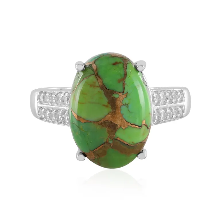 Dieser atemberaubende Ring besteht aus einem ovalen Kingman-Mohave-Türkis im Cabochon-Schliff mit einem Gewicht von 5,13 Karat, der nach ethischen Gesichtspunkten aus den Vereinigten Staaten bezogen wird. Flankiert von einer Kaskade glitzernder kambodschanischer Zirkone mit einem Gesamtgewicht von 0,306 Karat ist jeder Edelstein präzise geschliffen, um seine Brillanz zu erhöhen. Der Ring ist sorgfältig aus 2,85 Gramm 925er Sterlingsilber gefertigt und bietet einen Hauch von Raffinesse. Er eignet sich perfekt, um einem legeren Ensemble einen Farbtupfer zu verleihen oder ein Abendoutfit für einen besonderen Anlass zu ergänzen.