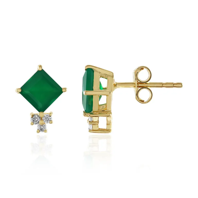 Entdecken Sie die Faszination dieser bezaubernden Ohrringe aus grünem Onyx. Diese quadratisch geschliffenen Schätze sind mit indischen Onyx-Steinen von insgesamt 1,03 Karat besetzt und mit kambodschanischen Zirkon-Details akzentuiert und bieten einen Hauch von Glamour. Das vergoldete 925er Sterling Silber verleiht ihnen einen warmen, königlichen Glanz. Diese Ohrringe sind ideal, um ein Business-Ensemble aufzuwerten oder einem Abendkleid einen raffinierten Touch zu verleihen. Sie versprechen Vielseitigkeit und Eleganz.
