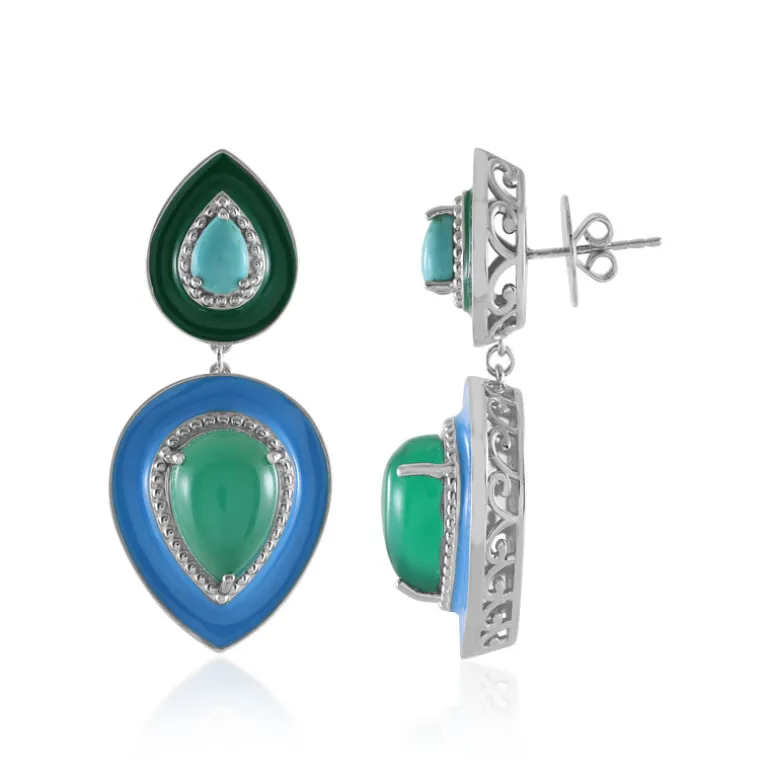 Entdecken Sie die lebendige Anziehungskraft dieser Ohrringe aus grünem Onyx und Kingman-Türkis von Dallas Prince Designs. Mit insgesamt 10,305 Karat sind diese Ohrringe mit tropfenförmigen Cabochons in elegantem 925er Sterlingsilber gefasst. Sie eignen sich perfekt, um Ihrem Outfit einen farbigen Akzent zu verleihen und sind eine exquisite Wahl sowohl für legere als auch für formelle Anlässe.