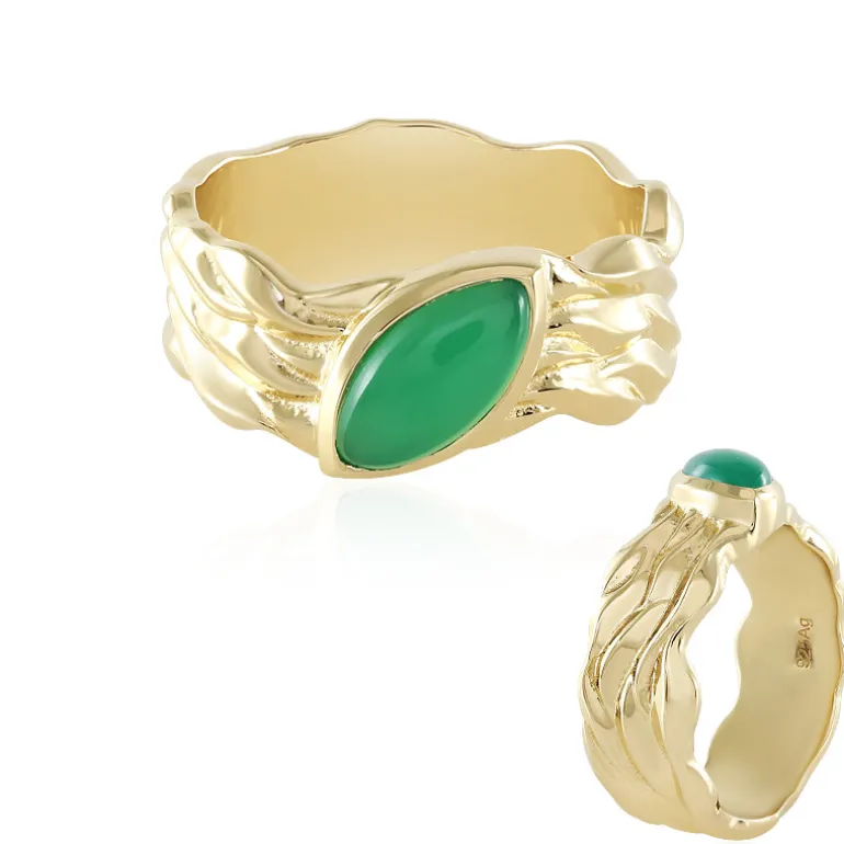 Lassen Sie sich von der üppigen Anziehungskraft dieses Rings mit grünem Onyx im Marquise-Cabochon-Schliff verzaubern, der in reichlich vergoldetem 925er Sterlingsilber gefasst ist. Mit einem Gewicht von ca. 1,026 Karat und einem lebendigen Edelstein aus dem Herzen Brasiliens fängt dieses Stück die Essenz tropischer Ausstrahlung ein. Das einzigartige Design des Rings, das fließende Flüsse nachahmt, verleiht Ihrem täglichen Tragen oder besonderen Anlässen Raffinesse. Als harmonische Mischung aus Stil und natürlicher Eleganz ist er eine faszinierende Ergänzung für jede Schmucksammlung.