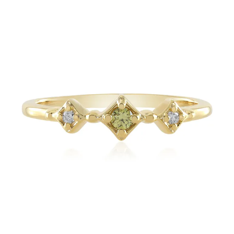 Erleben Sie die Anziehungskraft dieses exquisiten Rings mit einem atemberaubenden grünen Diamanten SI1 und zwei funkelnden Diamanten SI1 (H). Gefertigt aus vergoldetem 925er Sterlingsilber, verbindet dieser Ring Eleganz mit modernem Charme. Dieses Schmuckstück ist ideal, um jedem Outfit einen Hauch von Raffinesse zu verleihen und eignet sich sowohl für legere als auch für formelle Anlässe. Ein Muss für jede Schmuckliebhaberin.