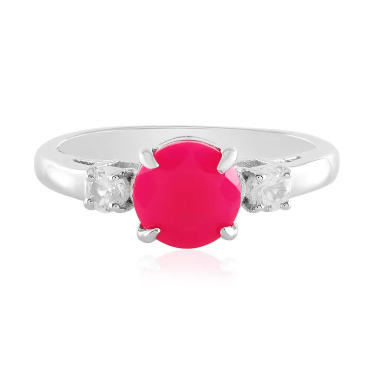 Setzen Sie ein kühnes Statement mit unserem strahlenden Himbeer-Chalcedon-Ring, der elegant von schimmernden kambodschanischen Zirkonen von insgesamt 0,265 Karat eingerahmt wird. Gefertigt aus 925er Sterlingsilber mit einer schimmernden Platinauflage, glänzt dieses Stück mit Raffinesse. Der 7 mm große, runde, himbeerfarbene Mittelteil sorgt für Gesprächsstoff und ist perfekt geeignet, um einem neutralen Ensemble einen Farbakzent zu verleihen oder ein schickes Cocktailkleid für Abendveranstaltungen zu ergänzen. Fügen Sie diesen 1,468 Karat schweren Edelstein Ihrer Sammlung hinzu und verleihen Sie ihr einen Hauch von Glamour.