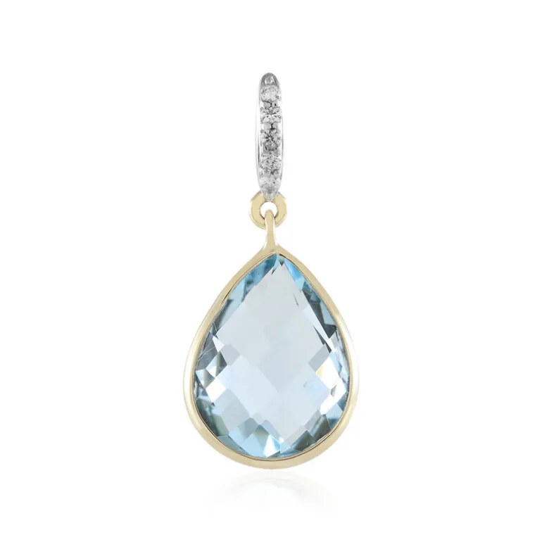 Dieser exquisite Anhänger zeigt einen himmelblauen Topas aus Brasilien im eleganten Briolett-Schliff in Tropfenform. Er wird von fünf kambodschanischen Zirkonen akzentuiert und ist in 9 K Gelbgold gefasst. Dieser Anhänger ist ideal, um jedem Outfit einen Hauch von Eleganz zu verleihen. Er passt sowohl zu legerer als auch zu formeller Kleidung und ist somit perfekt für jeden Anlass.