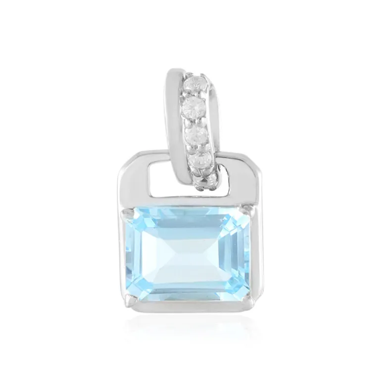 Mit diesem raffinierten himmelblauen Topas-Anhänger mit einem exquisiten, achteckigen Edelstein im Stufenschliff aus Brasilien verleihen Sie Ihrer Eleganz einen besonderen Ausdruck. Umgeben von schimmernden Zirkonen aus Tansania, ist dieses Stück aus 925er Sterlingsilber für zusätzlichen Glanz plattiert. Er eignet sich sowohl für legere als auch für formelle Anlässe und passt zu jedem Outfit, was ihn zu einem idealen Accessoire für den Übergang zwischen Tag und Nacht macht.