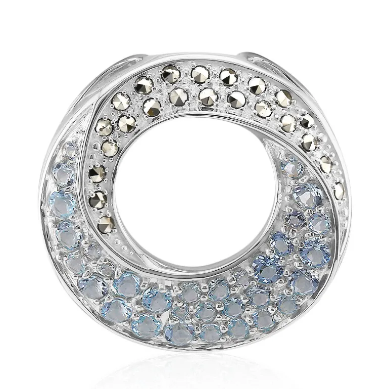Ein schillerndes Ensemble aus himmelblauen Topas-Edelsteinen, kunstvoll eingefasst in eine Fassung aus hochwertigem 925er Sterlingsilber. Dieser Anhänger besteht aus 32 Topas-Steinen mit einem Gesamtgewicht von 1,554 ct, die von 23 österreichischen Markasiten mit insgesamt 0,316 ct ergänzt werden. Das kreisförmige Design verleiht klassischer Eleganz eine moderne Note und ist perfekt geeignet, um jedem Outfit einen Farbakzent zu verleihen. Dieses Schmuckstück eignet sich sowohl für den Tag als auch für den Abend und zieht bei jeder Gelegenheit die Blicke auf sich.