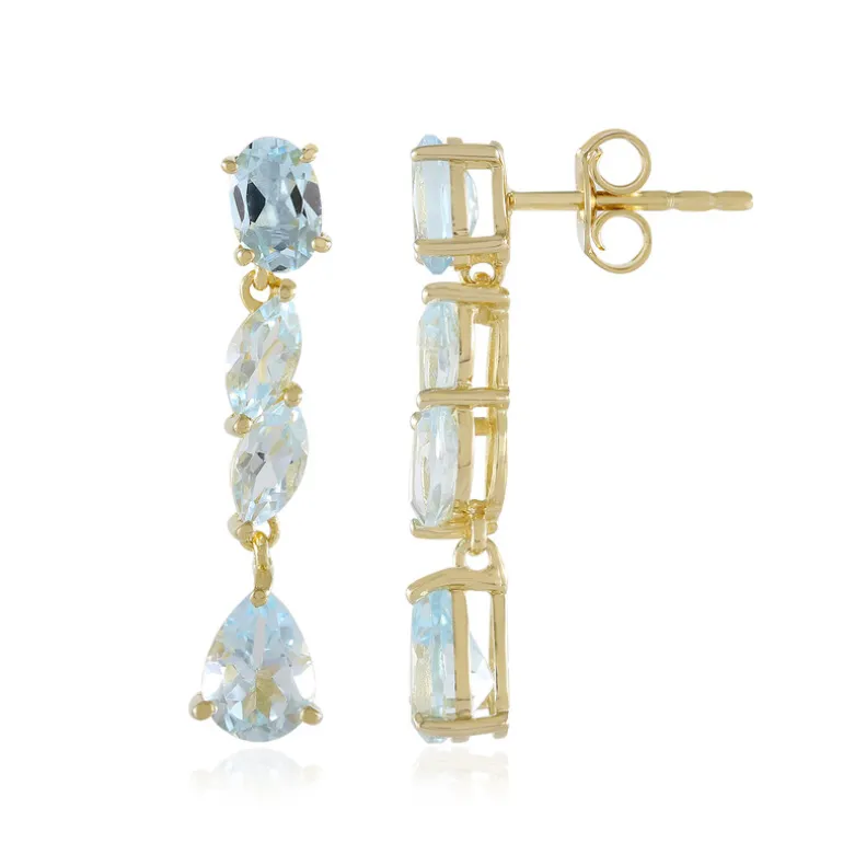 Diese eleganten Ohrringe präsentieren 3,78 Karat schillernde himmelblaue Topase in drei exquisiten Schliffen: tropfenförmig, oval und marquise. In vergoldetem 925er Sterlingsilber gefasst, bieten sie eine raffinierte Mischung aus Glanz und Stil. Sie eignen sich perfekt für formelle Anlässe oder verleihen Ihrem Alltagslook einen Hauch von Glamour und ziehen garantiert alle Blicke auf sich. Kombinieren Sie sie mit einem eleganten Kleid oder einer schicken Bluse für ein raffiniertes Ensemble.