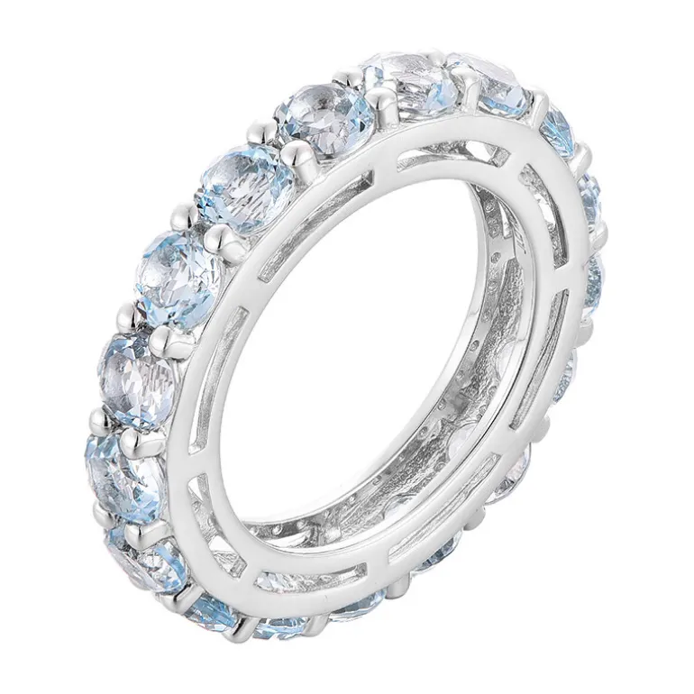 Entdecken Sie diesen bezaubernden Ring aus Sterlingsilber, der eine durchgehende Schleife aus himmelblauen Topas-Edelsteinen zeigt. Jeder sorgfältig facettierte Edelstein reflektiert das Licht und erinnert an einen klaren, heiteren Himmel. Das moderne Design mit dem detaillierten Band verleiht dem Ring eine künstlerische Note und macht ihn zu einem vielseitigen Schmuckstück, das sich sowohl für Freizeitausflüge als auch für besondere Anlässe eignet. Kombinieren Sie ihn mit einem leichten, luftigen Kleid oder einer schicken Bluse für einen subtilen Hauch von Eleganz. Seine leuchtenden Farben und die einzigartige Fassung machen ihn zu einer herausragenden Ergänzung für jede Schmucksammlung.