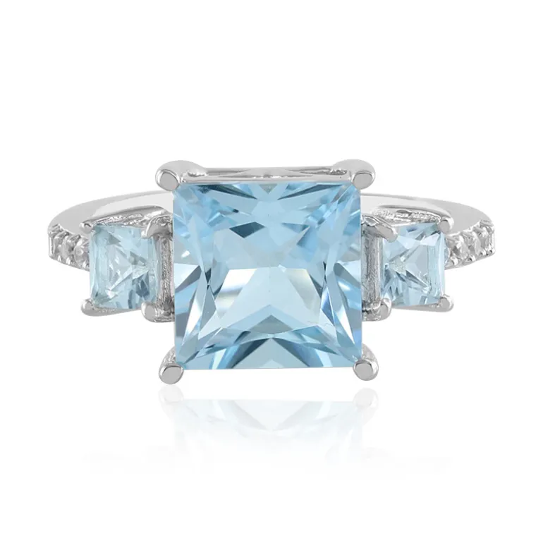 Lassen Sie sich von der Anziehungskraft des azurblauen Himmels verzaubern mit diesem atemberaubenden brasilianischen Ring mit himmelblauem Topas. Mit einem quadratischen Topas im Prinzessschliff von 3,87 Karat in der Mitte und zwei kleineren Topassteinen von insgesamt 0,709 Karat in der Mitte fängt dieses Schmuckstück die faszinierenden Farben eines wolkenlosen Tages ein. Der Ring ist außerdem mit funkelnden kambodschanischen Zirkon-Akzenten verziert, die seine Ausstrahlung noch verstärken. Der Ring besteht aus platiniertem 925er Sterlingsilber für zusätzlichen Glanz und Haltbarkeit und wiegt ca. 3,04 g. Sein Gesamtgewicht beträgt 4,741 ct, was ihn zu einer substanziellen und dennoch anmutigen Ergänzung jeder Sammlung macht. Dieses Schmuckstück eignet sich perfekt für besondere Anlässe oder als farblicher Akzent in Ihrem Alltagsoutfit und sorgt für Aufsehen und Gesprächsstoff.
