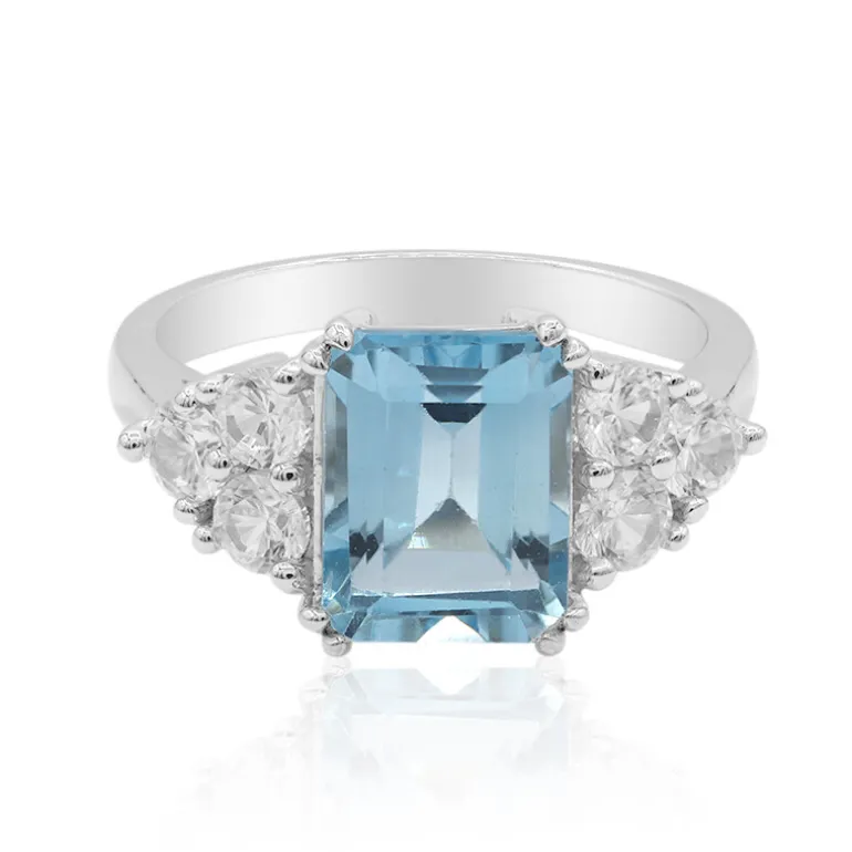 Erleben Sie die beruhigende Anziehungskraft eines himmelblauen Topas in der Mitte des Rings, der mit seinem Gewicht von 2,42 Karat im meisterhaften Achteckschliff die Essenz des brasilianischen Himmels einfängt. Dieser Ring kombiniert das ruhige Blau mit sechs funkelnden Zirkonen im Rundschliff aus Kambodscha mit einem Gesamtgewicht von 0,84 ct, die einen perfekten Kontrast bilden. Dieses raffinierte Schmuckstück aus 925er Sterlingsilber mit einem Gesamtgewicht von 3,26 ct sitzt elegant auf einem 23×19 mm großen Band. Es ist ein vielseitiges Accessoire, das sowohl zu legerer als auch zu formeller Kleidung passt und verspricht, Ihrem Ensemble einen Hauch von Glanz zu verleihen.
